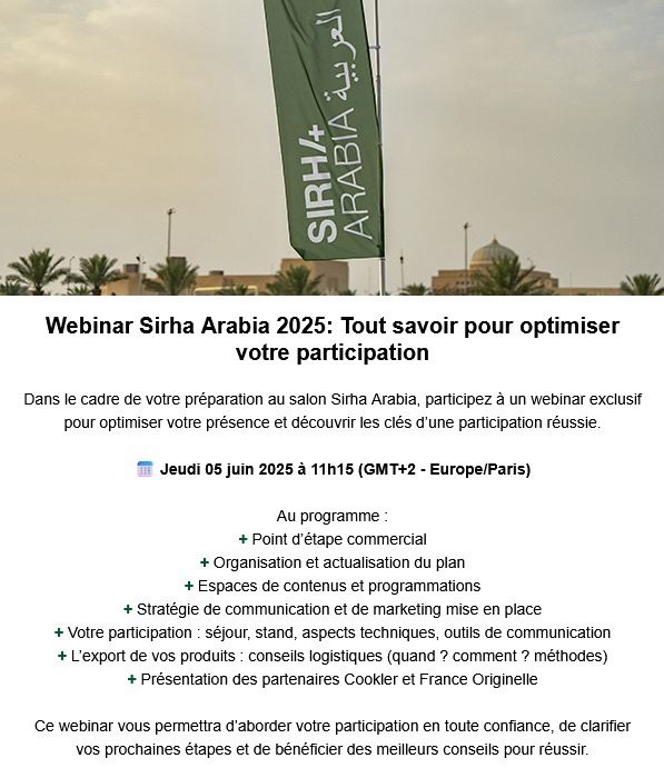 Pour ceux qui participeront au Sirha Arabia– Riyadh du 30 Sept au 02 Oct. 2025, un webinaire important se tiendra pour aborder les points clefs d’une participation réussie à cette 2eme édition.